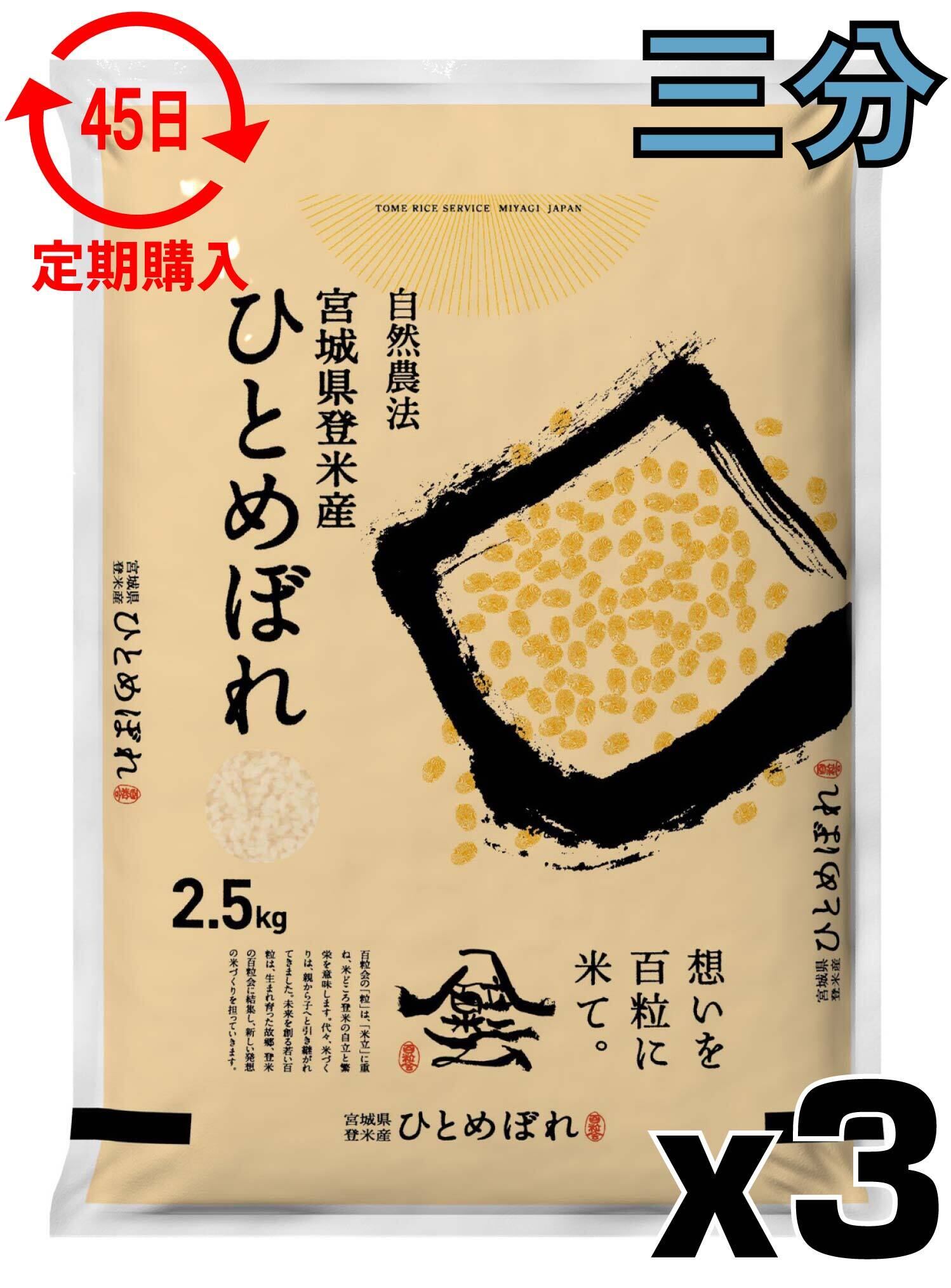 定期45日 令和7年産 登米産 ひとめぼれ 三分づき 7.5kg 農薬・化学肥料不使用栽培米
